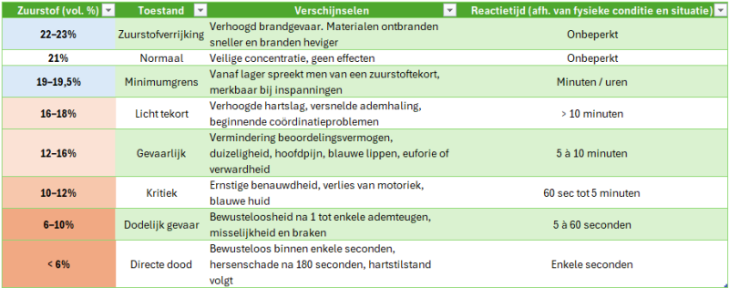 Zuurstofniveaus, verschijnselen/risico's en reactietijd